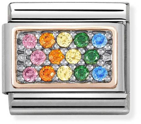 Nomination Rose Gold Rainbow 430313-09 -helasta löytyy sateenkaaren värit. Palan runko on valmistettu ruostumattomasta teräksestä ja ruusukullan värinen osa on 9 karaatin ruuskultaa. Kivet ovat zirconioita. Nomination-paloille myönnetään kahden vuoden takuu.