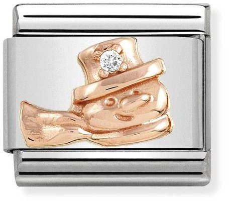 Nomination Rose gold Snowman with cubic zirconium 430305-20-korupalaa koristaa klassinen lumiukko. Hahmo on pinnoitettu 9 karaatin ruusukullalla, ja koristeltu kirkkaalla zirkonialla. Pala on valmistettu ruostumattomasta teräksestä. Nomination-paloille myönnetään kahden vuoden takuu.