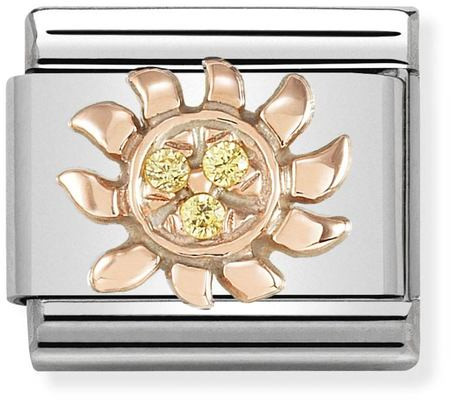 Luontoaiheiset Nomination Rose Gold -palat tuovat keräilykoruusi raikkautta ja kesäistä kepeyttä. Sun with Yellow CZ 430305-18 -mallissa esiintyy lämpimästi säteilevä aurinko. Tämä hurmaava korupala on loihdittu ruostumattomasta teräksestä, 9 kt punakullasta ja kolmesta keltaisesta zirkoniasta.