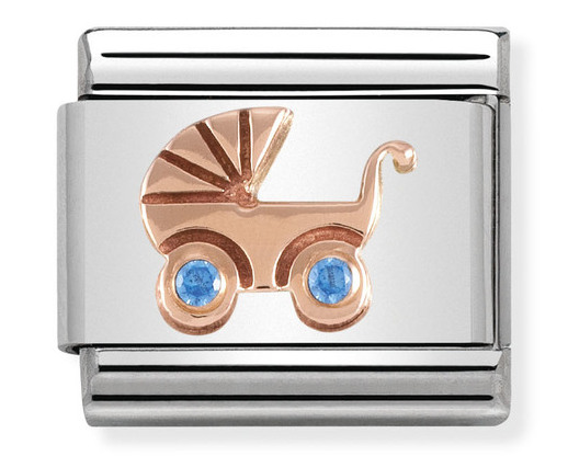 Nomination RoseGold Pram 430305-05 -korupala on valmistettu hopeanvärisestä ruostumattomasta teräksestä ja sen symboli on 9k punakultaa. Korupalassa on myös Swarovskin sinisiä zirkonia-koristekiviä. Nomination -korupaloille myönnetään kahden vuoden takuu ja ne toimitetaan valmistajan alkuperäisessä pakkauksessa!