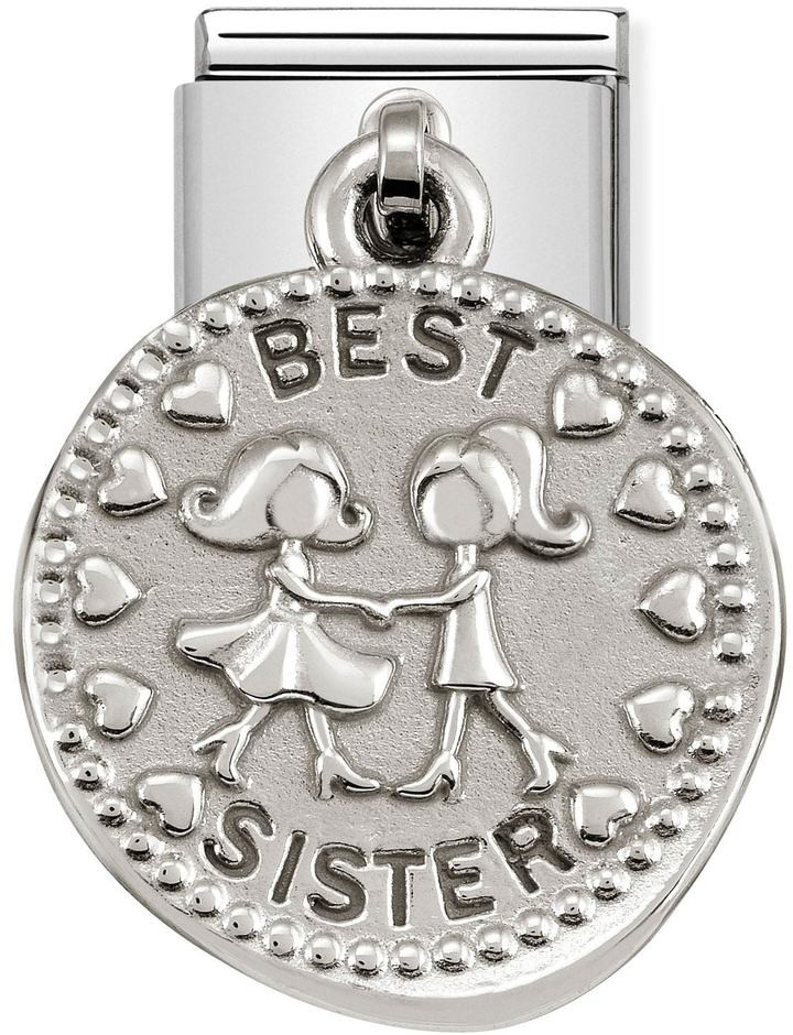 Muista rakasta siskoa. Nomination Silvershine Best Sister 331804-14 -korupala on taiteiltu ruostumattomasta teräksestä ja sterling-hopeasta. Kauniit symbolit ovat kuin lukuja päiväkirjasta, kuvaillen ajatuksia, tunteita ja elämän suuria hetkiä.