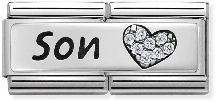 Nomination SilverShine double 330731-03 Son. Nomination SilverShine palat on valmistettu laadukkaasta ruostumattomasta teräksestä ja 925-Sterling hopeasta. Palaan on istutettu säihkyviä zirkoneja ja teksti on kirjailtu mustalla emalilla. Nomination paloille myönnetään kahden vuoden takuu!