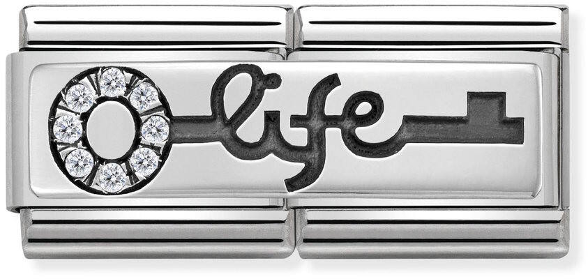 Nomination SilverShine double 330731-04 Key with life. Nomination SilverShine palat on valmistettu laadukkaasta ruostumattomasta teräksestä ja 925-Sterling hopeasta. Palaan on istutettu säihkyviä zirkoneja ja teksti on kirjailtu mustalla emalilla. Nomination paloille myönnetään kahden vuoden takuu!