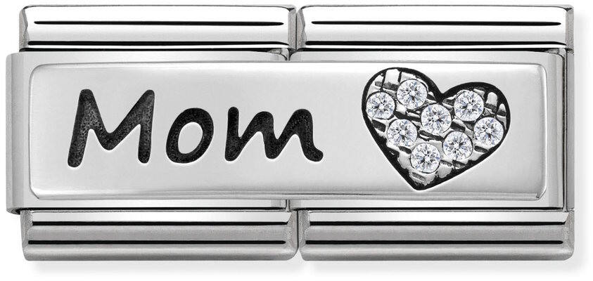 Nomination SilverShine double 330731-06 Mom with heart. Nomination SilverShine palat on valmistettu laadukkaasta ruostumattomasta teräksestä ja 925-Sterling hopeasta. Palaan on istutettu säihkyviä zirkoneja ja teksti on kirjailtu mustalla emalilla. Nomination paloille myönnetään kahden vuoden takuu!
