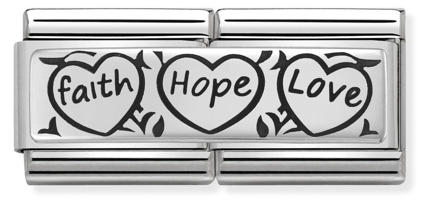 Nomination SilverShine Double Faith Hope Love 330710-11 -korupala on valmistettu hopeanvärisestä ruostumattomasta teräksestä ja sen symboli on 925-Sterling hopeaa. Nomination -korupaloille myönnetään kahden vuoden takuu ja ne toimitetaan valmistajan alkuperäisessä pakkauksessa!
