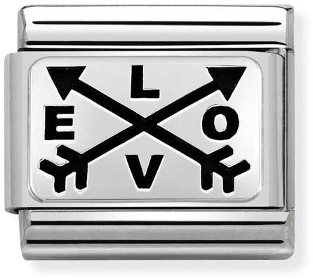 Nomination SilverShine Love with Arrows 330109-41. Palassa on ristiin menevät nuolet ja teksti LOVE. Pala on valmistettu ruostumattomasta teräksestä ja hopeasta, ja koristeltu emalimaalein. Nomination-paloille myönnetään kahden vuoden takuu.