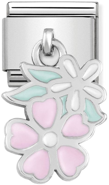 Roikkuvat symbolit ovat Nomination-keräilykorujen vetovoimaisimpia tähtiä! Silveshine-mallistoon kuuluvassa Pink and White Flowers 331805-10 -palassa kulkee mukana kirkkailla emaliväreillä koristeltu, sterling-hopeasta muotoiltu kukka-asetelma.