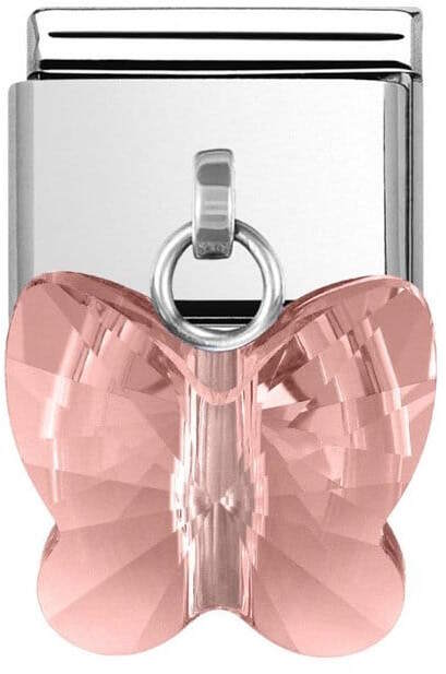 Nomination 030604-26 -palassa riippuu Swarovskin kristallista valmistettu, vaaleanpunainen perhonen. Materiaaliltaan pala on ruostumatonta terästä. Huom. Swarovskin elementeistä tehdyillä paloilla ei ole takuuta.