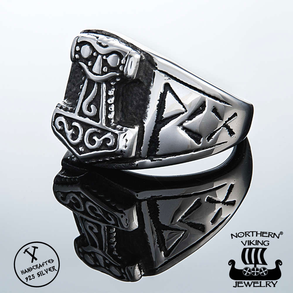 316L kirurginteräksestä valmistettu Northern Viking Jewelry Black Thorin Vasara NVJSO018 on tyylikäs miesten sormus. 24 grammaa painava sormus on edestä 1,6 cm leveä ja 2 cm korkea. Black Thorin Vasara -sormuksen keskiössä on Thorin vasara, jonka sivussa on riimukirjoitusta. Sormusta on saatavilla viidessä eri koossa 19-22,5 mm väliltä. Sormus toimitetaan uniikissa Northern Viking Jewelry® -juuttipussissa.