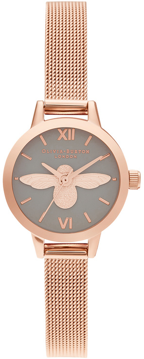 Olivia Burton 3D Bee, Blush Dial Rose Gold OB16MC54 on tyyliä pienessä koossa. Kellossa on ohut 23 mm leveä runko ja erittäin ohut 8 mm leveä mesh-ranneke helpostipuettavalla solkilukolla, ja taulua koristaa kaunis kimalainen ja roomalaiset indeksit. Kellon pinta on värjätty erittäin kestävällä ja naarmuuntumattomalla PVD-päällysteellä. Olivia Burton -kelloilla on 2 vuoden takuu, ja ne toimitetaan valmistajan alkuperäisessä rasiassa.