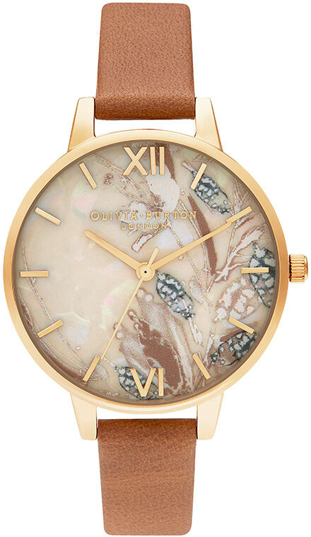 Olivia Burton Abstract Florals Honey Tan-Gold OB16VM39 -rannekellon kellotaulussa on moderni abstrakti kukkaisteema helmiäistä imitoivalla kermanvärisellä pohjalla, jonka vuoksi kello on hienovaraisen tyylikäs, jopa hieman vintage-henkinen, mutta samalla näyttävä. Ranneke tummanhunajan sävyistä aitoa nahkaa. Kellossa on 34 mm:iä leveä kullanvärinen teräsrunko ja 12 mm:iä leveässä rannekkeessa on pikakiinnitys, jonka vuoksi ranneke on helppo vaihtaa. Olivia Burton -kelloilla on 2 vuoden takuu, ja ne toimitetaan valmistajan alkuperäisessä rasiassa.