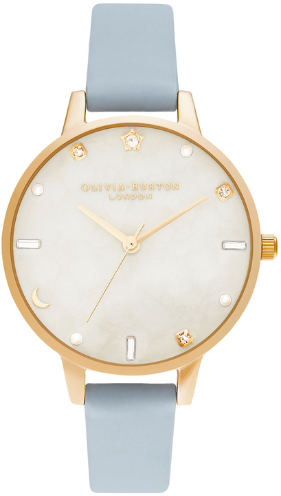Olivia Burton Celestial Chalk Blue OB16GD31-kellon valkoinen taulu kraatereineen imitoi kuun pintaa ja tauluun istutetut aidot Swarovskin kristallit ja helmet tähtiä. Ranneke on hennon vaaleansininen, ja pituudeltaan 14,5-20 cm, ja siinä on helposti kiinnitettävä pikakiinnityslukko, jonka vuoksi ranneke on helposti vaihtaa. Rannekkeen kiinnityskohdan leveys on 12 mm. Kellon rungon leveys on 34 mm:iä.
