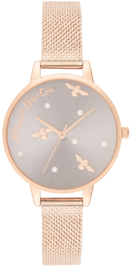 Olivia Burton Pearly Queen Pearl Detail Rose Gold OB16PQ04 -rannekellon kellotaululla ahkeroivat pienet mehiläiset ja tauluun on upotettu Swarovskin tekohelmiä. Kellossa on 34 mm leveä ruusukullansävyinen kehä ja mesh-ranneke. Olivia Burton -kelloilla on 2 vuoden takuu, ja ne toimitetaan valmistajan alkuperäisessä rasiassa.