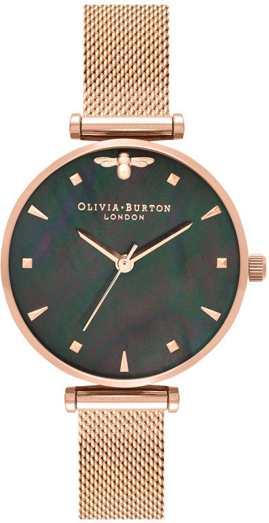 Olivia Burton Queen Bee Black Mother of Pearl Rose Gold Mesh OB16AM145 on ajan trendiin sopiva kello, joka on valmistettu täysin ruusukullansävyisestä teräksestä. Kellotaulussa on suuret osoittimet ja indeksit, jotka nousevat kauniisti esiin kellon sinivihreää aitoa helmiäistaustaa vasten. Kellotauluun on upotettu pieni mehiläishahmo - onhan Olivia Burtn kellojen isnpiraatio aina luonnossa. Rungon leveys on 30 mm:iä ja teräsrannekkeessa on pikakiinnitys, jonka vuoksi ranneke on helppo vaihtaa. Rannekkeen kiinnityskohdan leveys on 12 mm:iä. Olivia Burton -kelloilla on 2 vuoden takuu, ja ne toimitetaan valmistajan alkuperäisessä rasiassa.