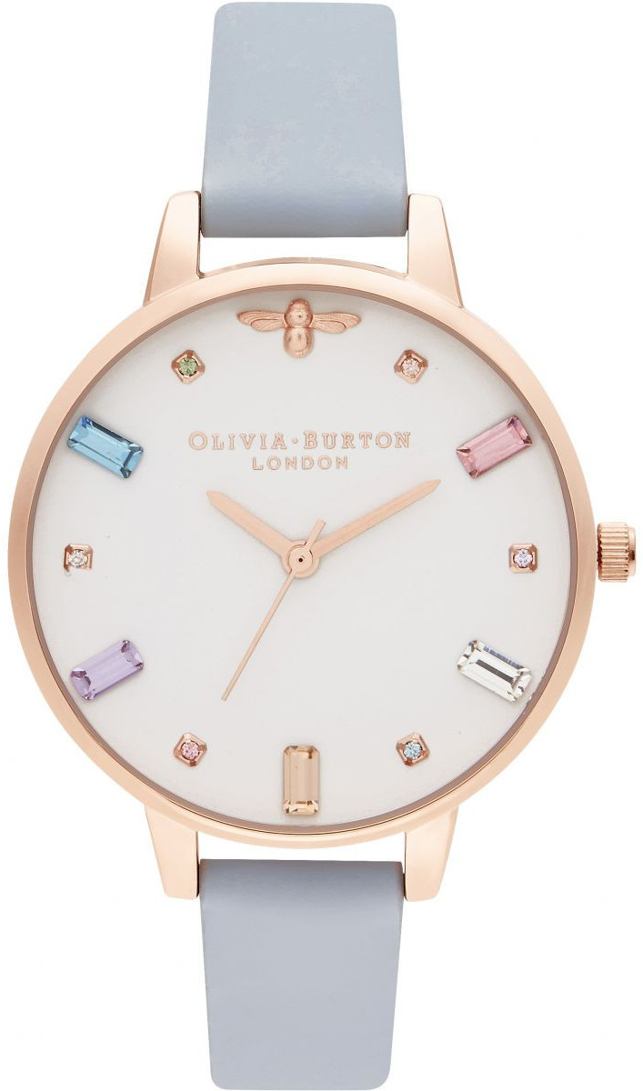 Olivia Burton Rainbow Bee Demi Chalk Blue & Rose Gold -rannekellossa on simppeli valkoinen kellotaulu, jonka ylälaidassa pörrää valoisuutta ja yhteisöllisyyttä symboloiva pieni mehiläinen. 34 mm leveä runko on valmistettu ruostumattomasta teräksestä ja sen pinta on kauniin punakullanvärinen. Raikkaita sävyjä kelloon tuovat myös upeat Swarovski-kristallit. Kokonaisuuden kruunaa vaaleansininen nahkaranneke.