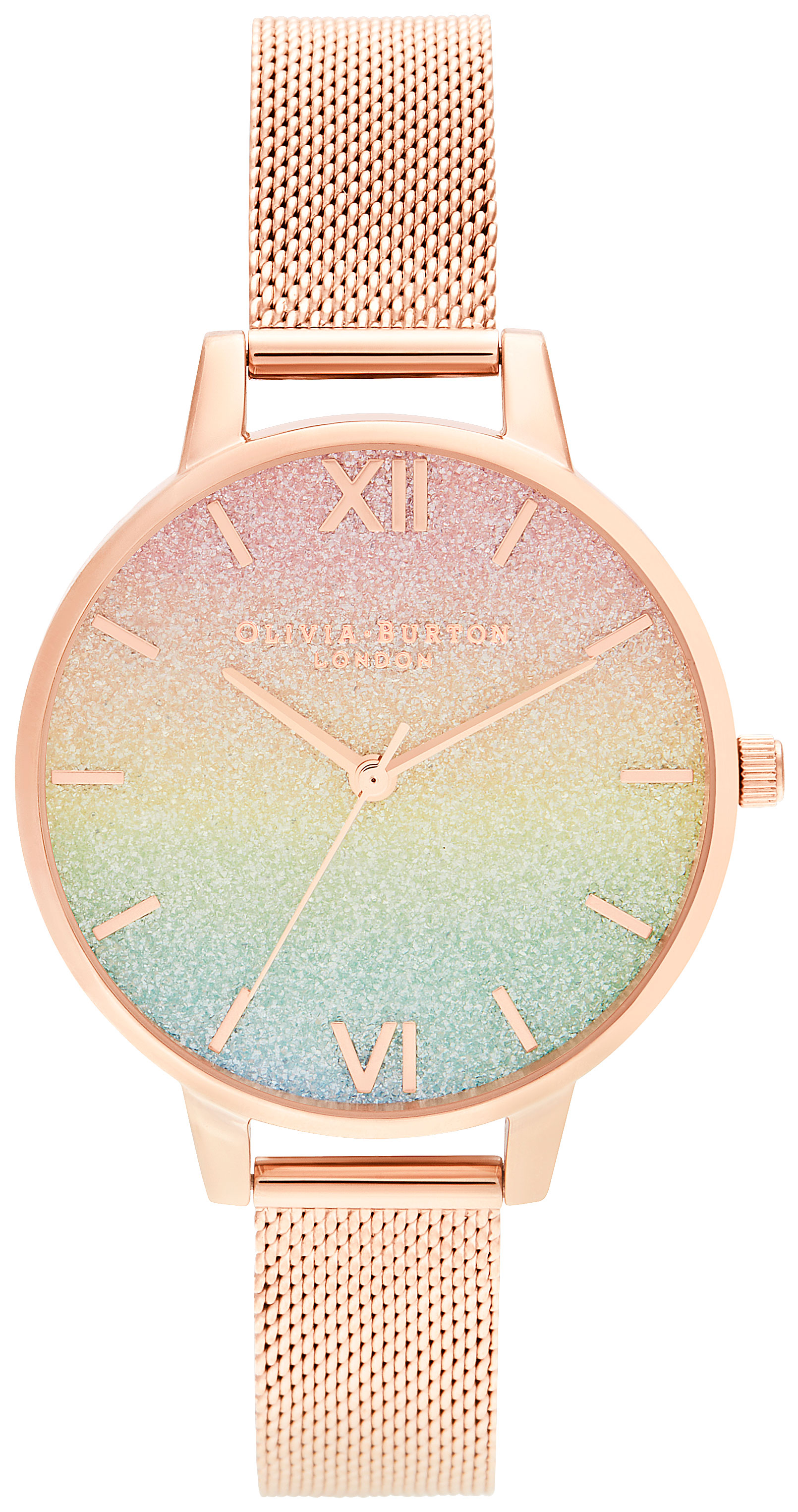 Olivia Burton Rainbow Glitter Dial & Rose Gold Mesh OB16RB18 on tyylikäs naisten rannekello, jossa on punakullanvärinen ruostumattomasta teräksestä valmistettu 34 mm leveä runko. Kellon punakullanvärinen mesh-ranneke on 12 mm leveä. Kellon glitterillä koristeltua liukuvärjättyä kellotaulua koristaa ruusukullanväriset osoittimet ja indeksit. Vesitiiviysluokka on ainoastaan 1 ATM eli kyseinen malli kestää esimerkiksi vesisadetta ja roiskeita. Olivia Burton -kelloilla on 2 vuoden takuu, ja ne toimitetaan valmistajan alkuperäisessä rasiassa.
