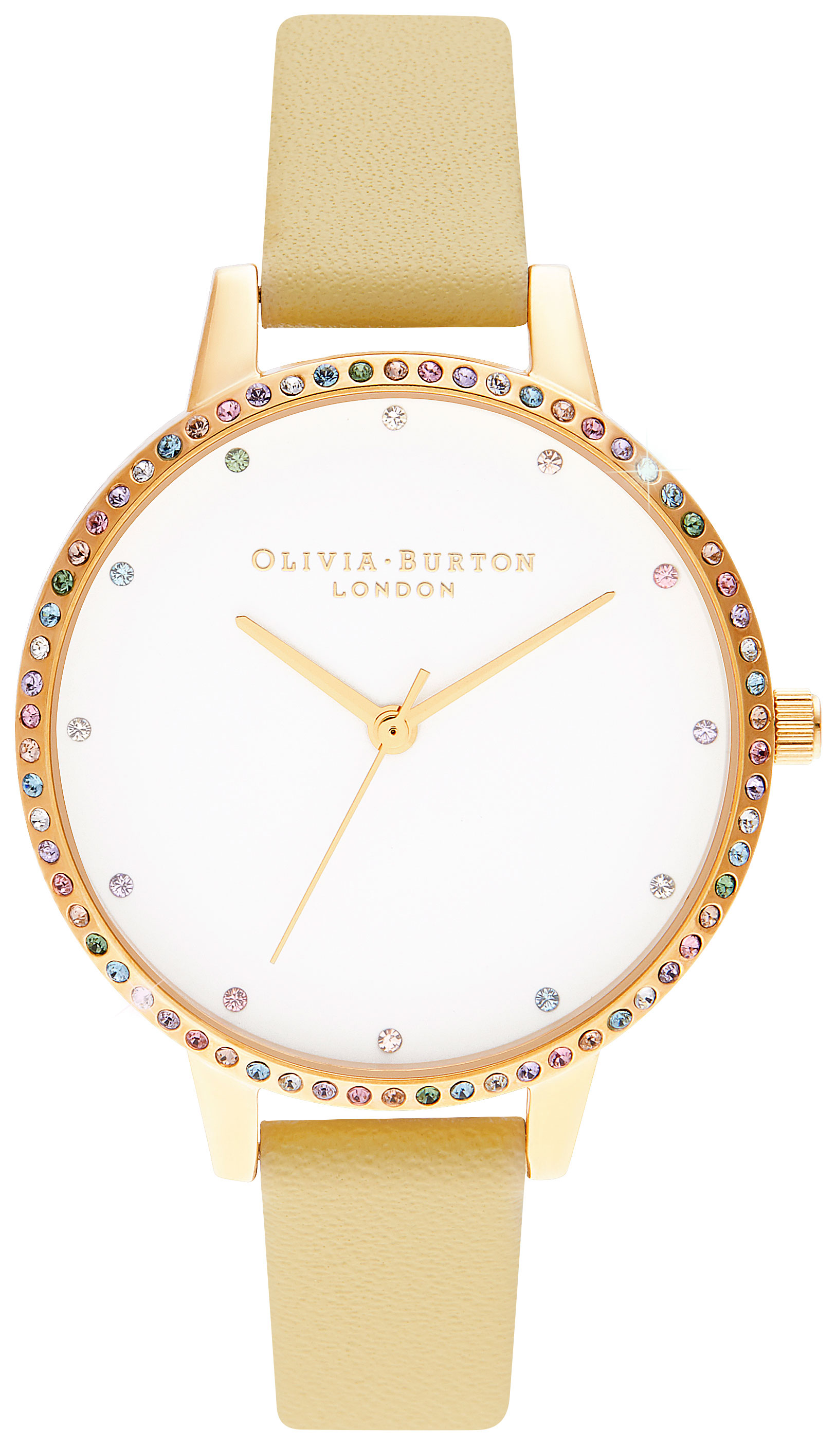 Olivia Burton Rainbow Bezel, Sunshine & Gold Bracelet OB16RB20 on pirtsakka naisten rannekello, jossa on kullanvärinen ruostumattomasta teräksestä valmistettu 34 mm leveä runko. Kellon keltainen nahkaranneke on 12 mm leveä. Kellon valkoista kellotaulua koristaa kullanväriset osoittimet ja Swarovski-kristallit. Swarovskit kiertävät myös kellon kehää, ja niitä on kellossa yhteensä 78 kappaletta. Vesitiiviysluokka on ainoastaan 1 ATM eli kyseinen malli kestää esimerkiksi vesisadetta ja roiskeita. Olivia Burton -kelloilla on 2 vuoden takuu, ja ne toimitetaan valmistajan alkuperäisessä rasiassa.