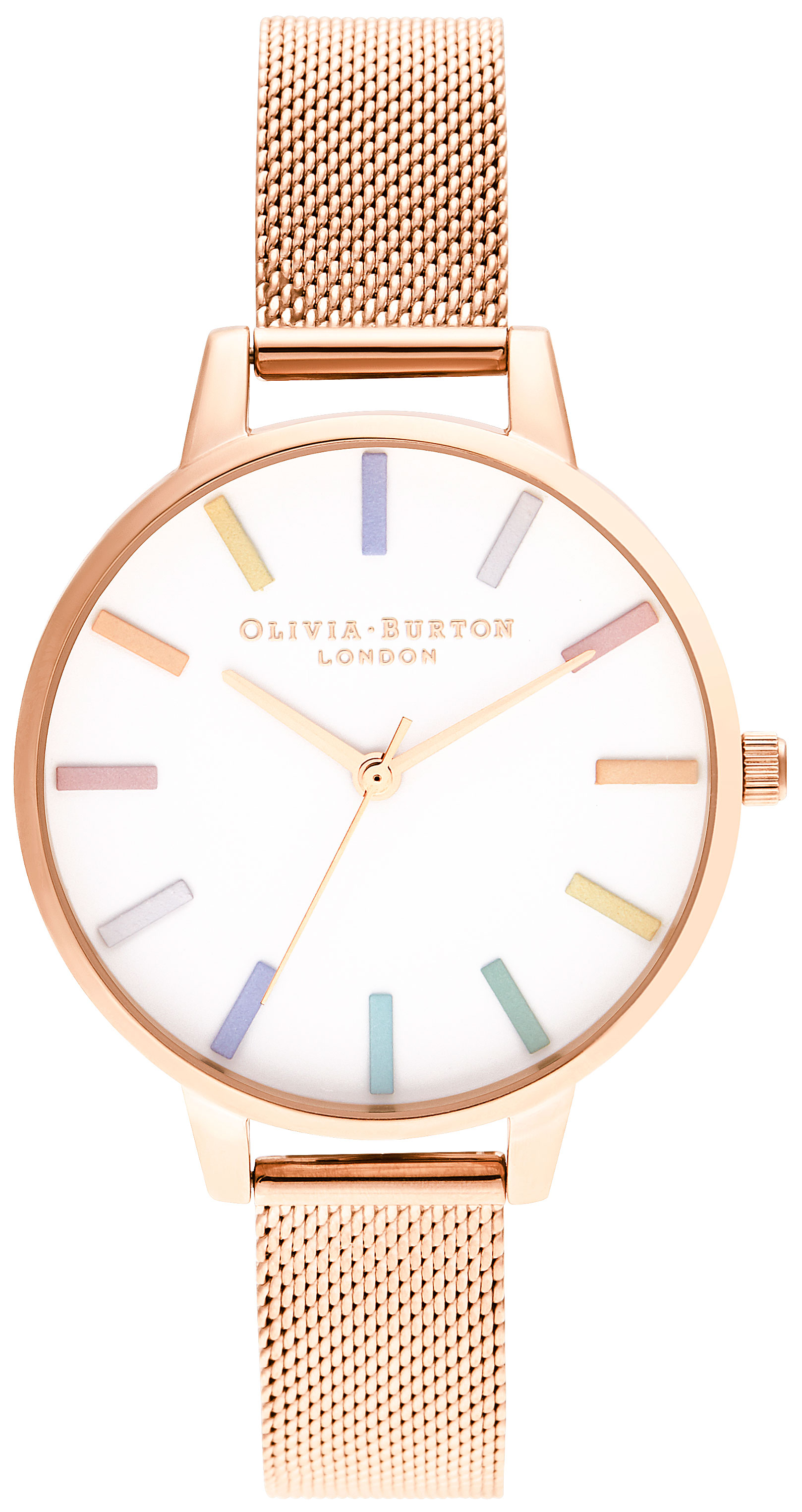 Rainbow Rose Gold Mesh ORB16RB24 on kaunis naisten kello, jossa on ruusukullanvärinen 34 mm leveä runko. Kellossa on 12 mm leveä mesh-ranneke, joka on väriltään punakultaa. Kauneuden kruunaa värikkäät indeksit ja ruusukullanväriset osoittimet valkoisessa kellotaulussa. Vesitiiviysluokka on ainoastaan 1 ATM eli kyseinen malli kestää esimerkiksi vesisadetta ja roiskeita. Olivia Burton -kelloilla on 2 vuoden takuu, ja ne toimitetaan valmistajan alkuperäisessä rasiassa.
