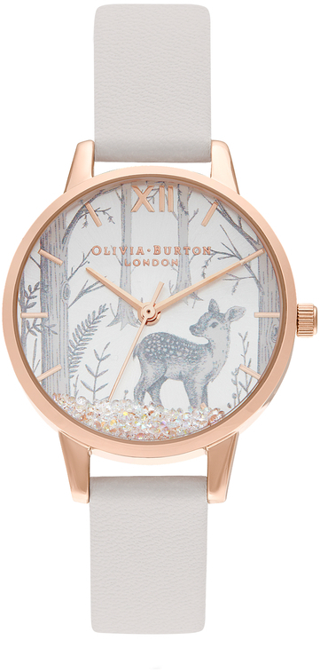 Olivia Burton Snow Globe Vehan Blush OB16SG11-naisten rannekello ihastuttaa klassisella lumisadepalloteemallaan. Kellossa on käsinmaalattu, hopeinen tausta, jossa on kuvattu talvinen metsämaisema ja kauris. Kellon hieman kuperan kaksoislasin sisässä on irtonaisia Swaroskin kristalleja, jotka liikkuvat kuin lumihiutaleet lasipallon sisällä. Talvinen värimaailma jatkuu kellon puuterinvärisessä vegaanisessa rannekkeessa, joka on helppo säätää ranteeseen sopivaksi. Rannekkeen pituus 14-19,5 cm, ja paksuus 12 mm. Rungon leveys on 30 mm. Olivia Burton -kelloilla on 2 vuoden takuu, ja ne toimitetaan valmistajan alkuperäisessä rasiassa.