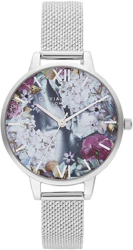 Olivia Burton Under The Sea Silver Boucle Mesh OB16US11-rannekkellon helmiäistä imitoiva kellotaulu on kuin se olisi tehty oikeista syvän meren simpukoista. Kellossa on kaunis merihenkinen tummansininen värimaailma ja kukkakuviointi. Kimaltava teema jatkuu kellon teräksisessä mesh-rannekkeessa. Rungon leveys on 34 mm:iä ja ranneke on vain 12 mm leveä. Rannekkeessa on pikalukitus, jonka vuoksi se on helppo vaihtaa. Olivia Burton -kelloilla on 2 vuoden takuu, ja ne toimitetaan valmistajan alkuperäisessä rasiassa.