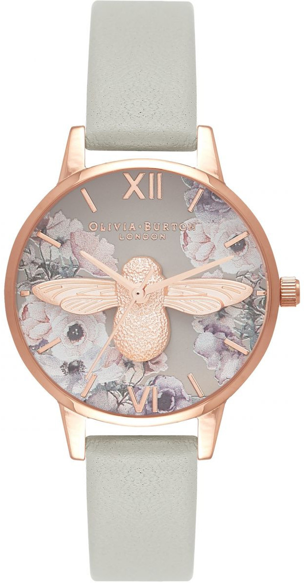 Mehiläisteemaiset Olivia Burton -kellot ovat mallistomme persoonallisimpia tuotteita! Watercolour Florals Grey & Rose Gold -kellon kukallinen kellotaulu saa upean 3D-efektinsä nimenomaan sen pinnasta kohoavasta mehiläisestä. Tässä mallissa runko on 30 mm leveä ja valmistettu ruostumattomasta teräksestä. Harmahtava ranneke on materiaaliltaan mukavan pehmeää nahkaa.
