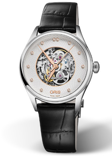 Oris Artelier Skeleton 01 560 7724 4031-07 5 17 64FC on tyylikäs naisten kello, jossa skeleton kellotaulu ja timantti indeksit. Kellotaulun läpi näkyy kellon koneisto ja kellossa on musta nahkaranneke. Kellon rungon halkaisija on 33 mm ja rannekkeen leveys kiinnityskohdasta 17 mm. Mallissa on Oris 560-automaattikoneisto, joka pohjautuu Etan 2671 -koneistoon. 25-kivisessä koneistossa 38 tunnin käyntivara. Oris kelloille myönnetään 2 vuoden takuu ja ne toimitetaan valmistajan alkuperäisessä rasiassa.