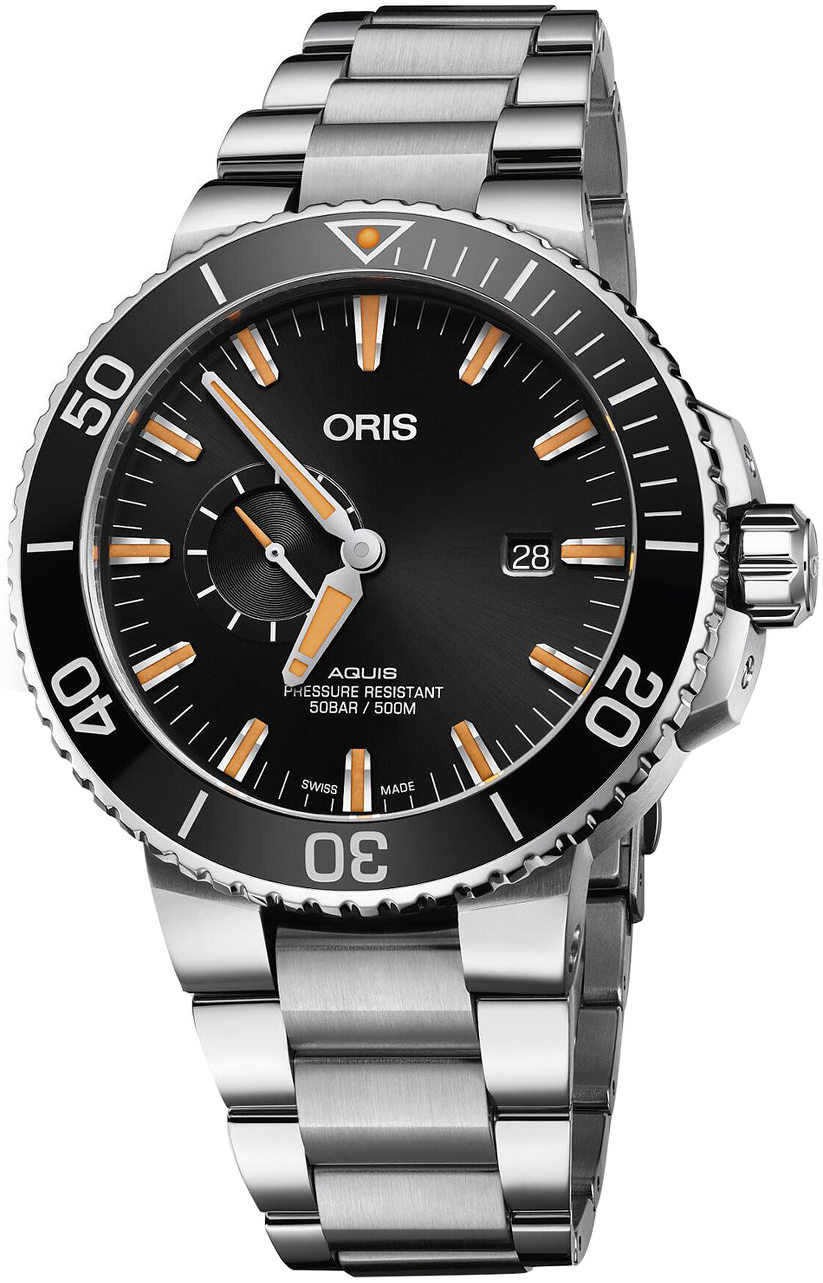Oris Aquis Small Second Date 01 743 7733 4159-8 24 05 PEB - kellossa on musta kellotaulau ja oranssit luminoituvat indeksi. Kellon rungon leveys on 45,5 mm. Kestävä Sellitan SW220-1-koneistoon perustuvan Oris 743-automaattikoneiston ansiosta kellolla on 38 tunnin käyntivara. Rannekkeen kiinnityskohdan leveys on 24 mm:iä. Oris-kelloille myönnetään 2 vuoden takuu ja ne toimitetaan valmistajan alkuperäisessä rasiassa.