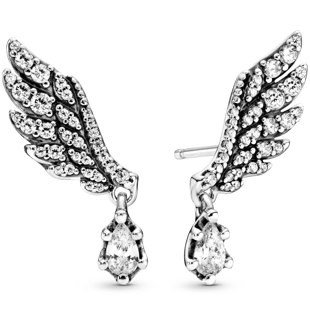 Pandora Dangling Angel Wing nappikorvakorut 298493C01. Näihin siiven mallisiin korvakoruihin on istutettu reilusti kirkkaita zirconioita. Korvakorujen korkus on 18,5mm ja niissä on tappikiinnitys. Pandora-korut toimitetaan valmistajan alkuperäisessä rasiassa.