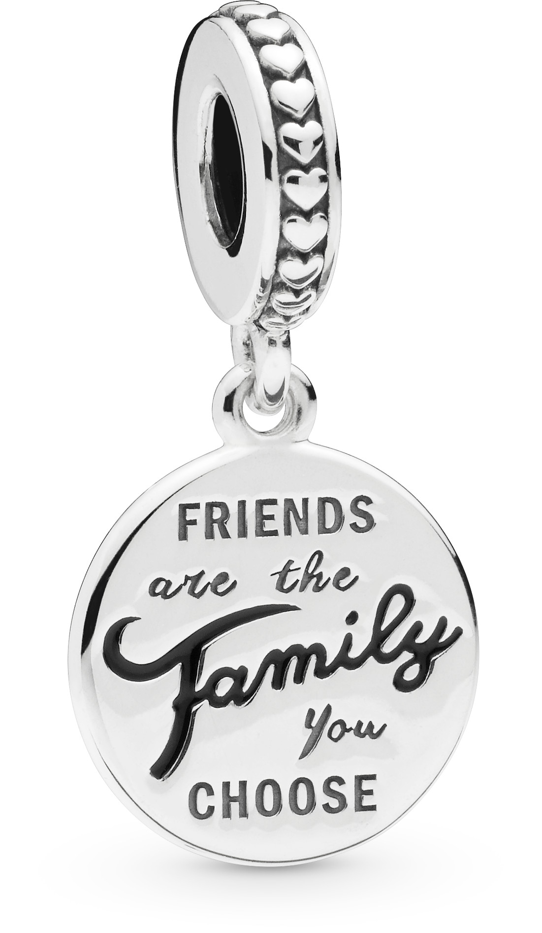Pandora Friends Are Family 798124EN16-helaan on kirjailtu teksti "Ystävät ovat perhe, jonka valitsemme" ja se on omistettu ystävyydelle. Hela on valmistettu sterling-hopeasta. Pandora-korut toimitetaan valmistajan alkuperäisessä pakkauksessa.