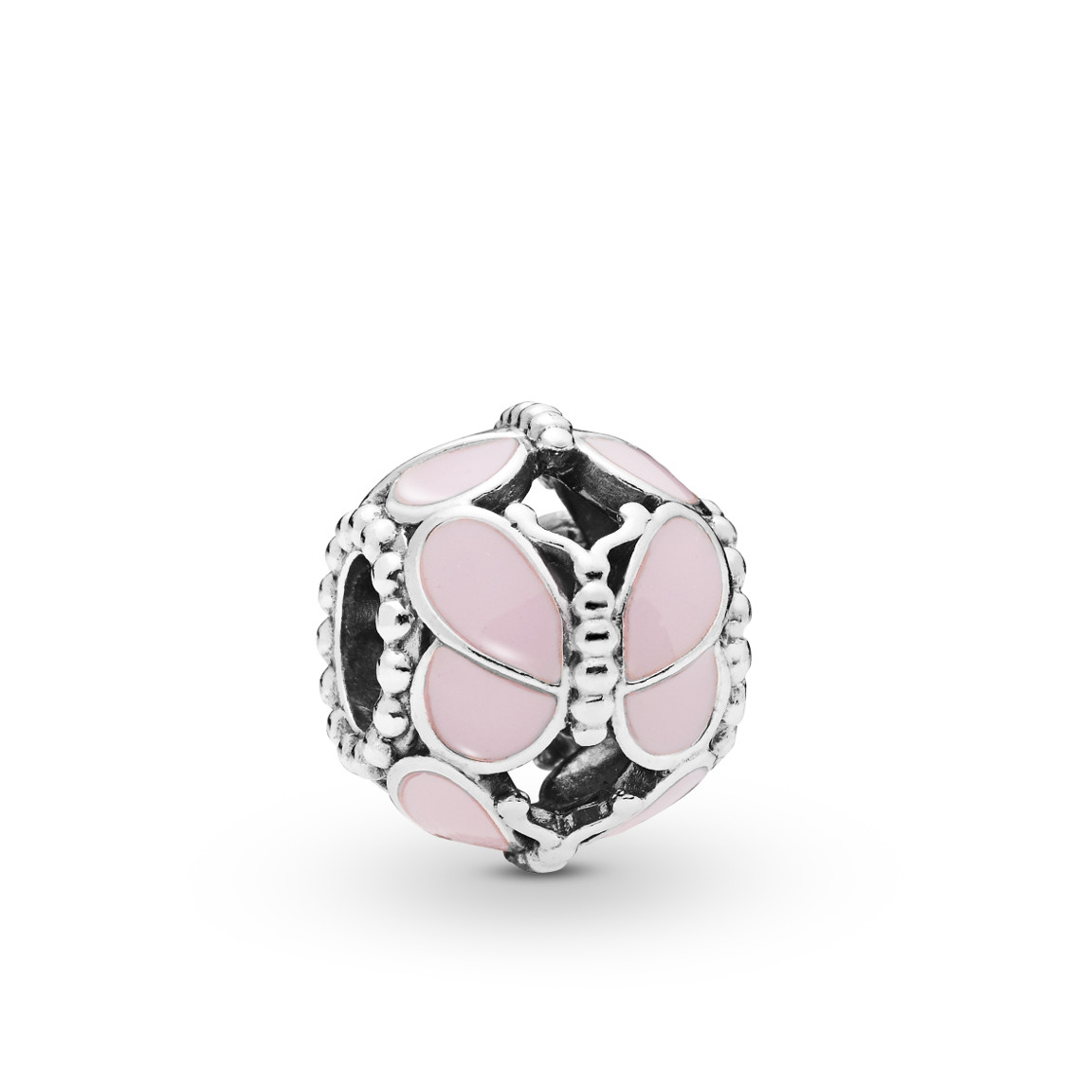Pink Butterflies -hela 797855EN160 kuuluu Pandoran lennokkaaseen Wings To Fly -mallistoon. Koristeelliset perhoskuviot helan pintaan on tyylitelty sterling-hopeasta ja vaaleanpunaisesta emalista.