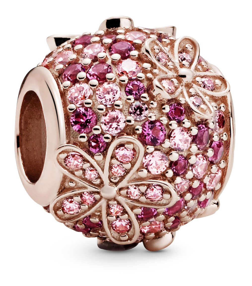 Pandora Moments -sarjaan kuuluva Pink Pavé Daisy Flower 788797C01 -hela on valmistettu metalliseoksesta, joka on pinnoitettu 14k ruusukullalla. Se on koristeltu korukivillä. Helan mitat ovat 12 x 9,8 x 12 mm. Pandora-korut toimitetaan valmistajan alkuperäisessä pakkauksessa.