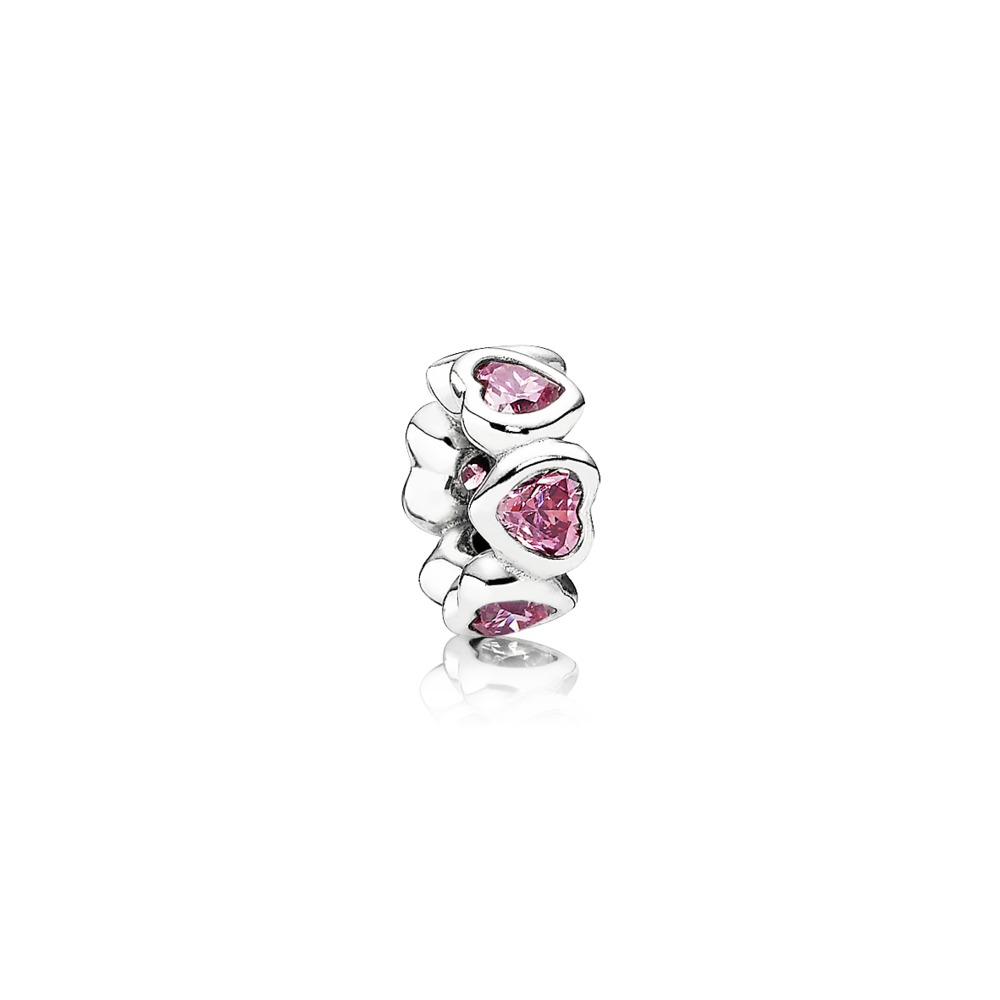 Hopeasta valmistettu Pandora 791252CZS Säihkyvät sydämet-välipala. Palassa on pinkkejä zirkonia-koristekiviä. Pandora helat toimitetaan postikuluitta valmistajan alkuperäisessä lahjapakkauksessa.