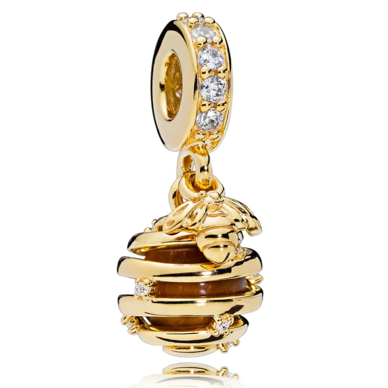 Pandora Sweet As Honey -helassa 767044CZ pörrää pesäänsä vartioiva mehiläinen. Hela on valmistettu sterling-hopeasta ja pinnoitettu 18 karaatin keltakullalla. Koristeeksi on aseteltu kirkkaita zirkonioita ja pesän sisään upea tiikerinsilmä-korukivi. Toimitus valmistajan alkuperäisessä pakkauksessa.