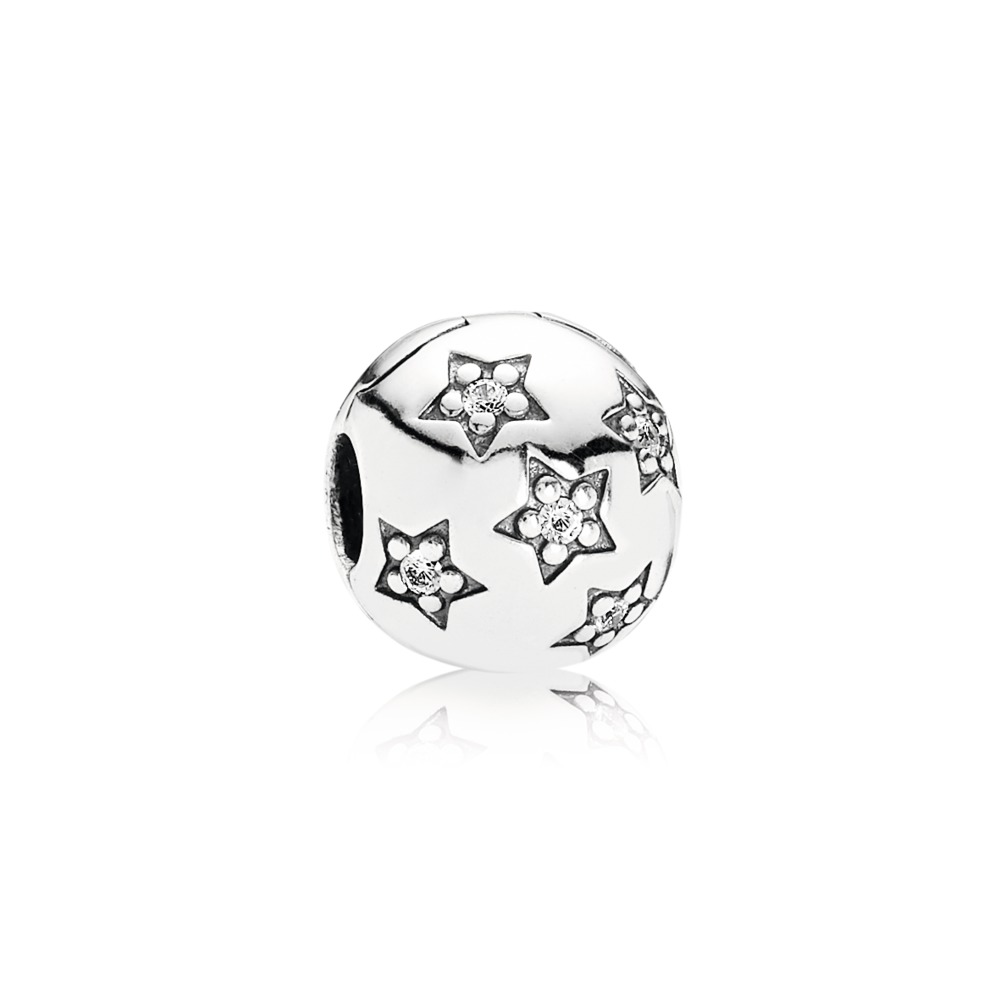 Hopeasta valmistettu Pandora 791058CZ Tähtiyö-lukkopala. Tähdet ovat zirkonia-koristekiviä. Pandora helat toimitetaan postikuluitta valmistajan alkuperäisessä lahjapakkauksessa.