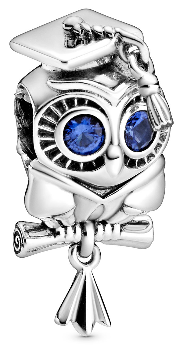 Pandora viisas pöllö valmistujais 798907C01 -hela on valmistettu sterling-hopeasta ja sen silminä toimii siniset korukivet. Pandora-korut toimitetaan valmistajan alkuperäisessä pakkauksessa.