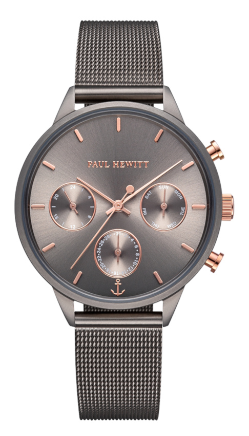 Paul Hewitt Everpulse PH-E-GRM-GRM-52S-kello on valmistettu ruostumattomasta teräksestä, ja siinä on monipuoliset ominaisuudet, kuten päivyri ja viikonpäivänäyttö. Metalliharmaassa kellossa on ruusukullansävyiset osoittimet, naarmuuntumaton safiirilasi ja säädettävä teräksinen mesh-ranneke. Rungon leveys on 38mm, paksuus 9mm ja rannekkeen kiinnityskohdan leveys 16mm. Kellolla on 2 vuoden takuu, ja se toimitetaan valmistajan alkuperäisessä rasiassa.