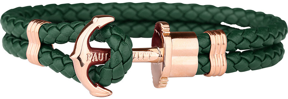 Paul Hewitt rannekoru vihreällä nahkapunoksella. Tämän merihenkisen rannekorun ankkuri toimii kiinnikkeenä. Koru edustaa laivastotyyliä ja on erittäin mukava käytää mm. kevyen painonsa ansiosta. Punakullan väriset kiinnikkeet sekä ankkuri sopivat yhteen vihreän punoksen kanssa. Rannekoru on parhaimmillaan yhdistettuna saman värimaailman Paul Hewitt rannekelloon.