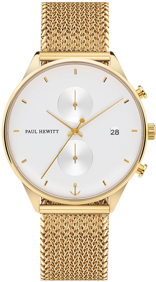 Paul Hewitt PH-C-G-W-50S Chrono Line on täydellinen kello huoliteltua, mutta samalla astetta räväkämpää tyyliä suosiville. Tässä muodikkaassa miesten mallissa on valkea kellotaulu ja kerrassaan upea "kudottu" teräsranneke. 42 mm leveä runko pitää sisällään laadukkaan Japanilaisen koneiston. Kellon pintaa suojaa naarmuuntumaton safiirilasi. Sekuntikello ja päivyri tuovat myös käytännöllisyyttä komean ulkonäon rinnalle.