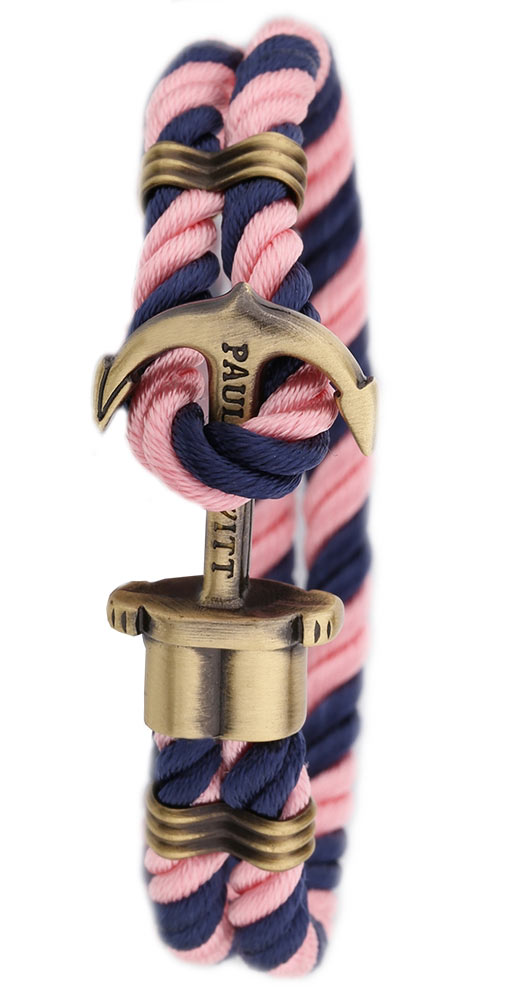 Tässä sini-vaaleanpunaisessa rannekorussa on käytetty punottua nylonia ja yhdistetty koru messingistä valmistettuun ankkuriin, joka toimii kiinnikkeenä. Ankkuri toimii yksityiskohtana, joka jää mieleen ja messinki antaa oman tyylinsä koruun. Helppokäyttöinen ja kevyt koru sopii rentoon olemiseen ja leikkisä väritys tuo ilmettä tyyliin.