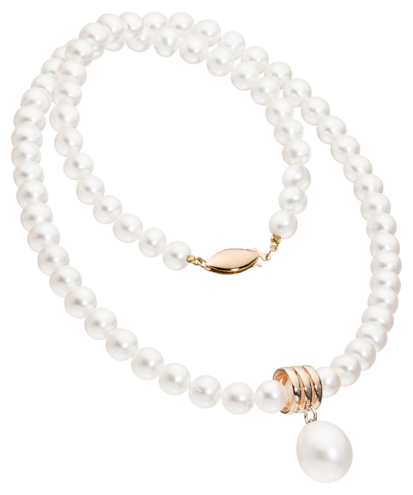 Pirami-kaulakorun riipukseen on valittu on valkea ja hohtava 9mm pisaramainen makeanvedenhelmi. Kaulakorun riipusosan design on yksinkertaisen tyylikäs ja se on 14 karaatin keltakultaa. Helmikaulanauhan 6mm helmet ovat aitoja viljeltyjä valkeita makeanvedenhelmiä. Helminauhaan valitut helmet ovat muodoltaan hieman ovaalisia ja niissä on hyvä hohto. Kaulanauhan pituus on 45cm ja sen laadukas lukko on sileää 14k keltakultaa.