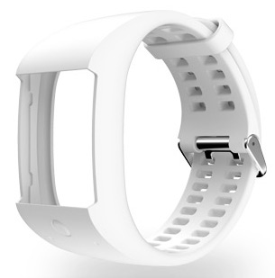 Valkoinen Polar M600 ranneke, jonka koko on M/L. Rannekkeen pituus on säädettävissä 145mm-235mm välillä.