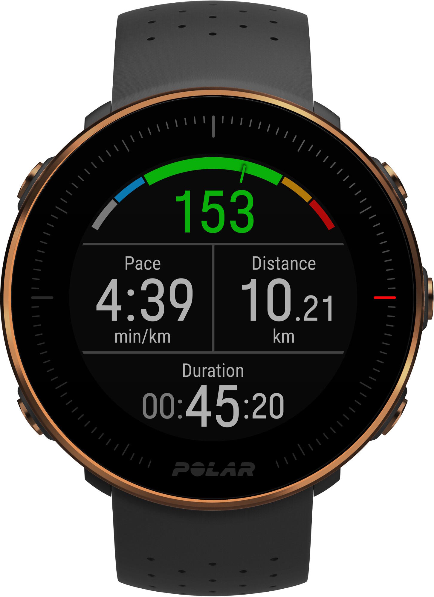 Polar Vantage M Copper painaa vain 45 grammaa, joten se ei häiritse harjoittelun aikana tai jokapäiväisessä elämässä vaan tuntuu huomaamattomalta. Lisäksi laitteessa on kevennetty ja tuuletusaukoin varustettu ranneke, joka varmistaa, että laite tuntuu miellyttävältä kovimpienkin harjoitusten aikana. Laitteessa on vaihdettavat rannekkeet ja standardi 22 mm:n pikakiinnitys, joten voit halutessasi vaihtaa minkä tahansa oikean levyisen rannekkeen kelloon.
