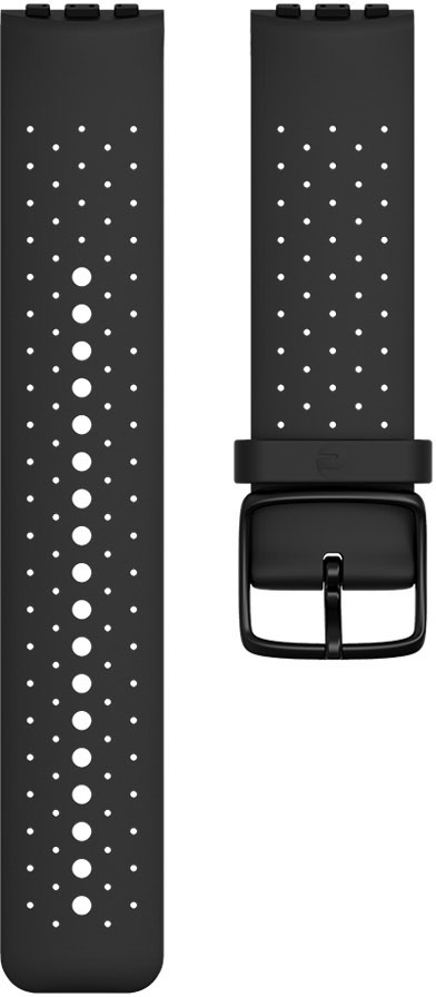 Tyylikkään mustaa Polar Vantage M -ranneketta on saatavilla kahdella eri pituudella: S pienemmille ranteille ja M/L normaaleille sekä isomman ranteen omaaville (S/M ranteen ympärys 130–175 mm, L ranteen ympärys 140–210 mm) Materiaaliltaan ranneke on kestävää ja mukavantuntuista TPE muovia.