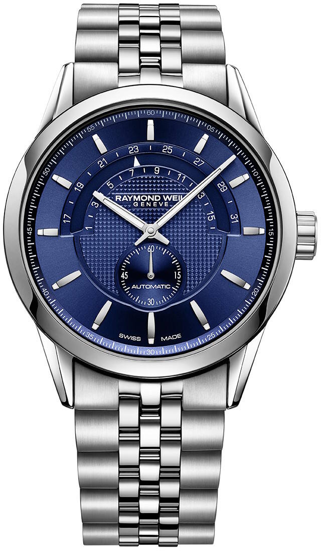 Raymond Weil 2738-ST-50001 Freelancer Automatic -kellossa on RW4250 -automaattikoneisto. Koneistossa on 38 tunnin käyntivara ja sitä voidaan vetää myös käsin. Kellossa on säkähdyttävä puolikuun muotoinen päivyriasteikko. Kellossa on näyttävä sininen kellotaulu ja teräsranneke. Kellon rungon leveys on 42mm ja paksuus 10,7mm. Raymond Weil 2738-ST-50001 Freelancer Automatic toimitetaan valmistajan alkuperäisessä rasiassa. Kellolle myönnetään kahden vuoden takuu, joka on laajennettavissa kolmen vuoden takuuksi rekisteröimällä kello Raymond Weilin kotisivuilla.