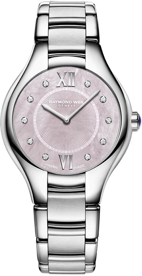 Raymond Weil Noemia 5132-ST-00986 -kellossa on kaunis vaaleanpunainen helmiäiskellotaulu. Kellotauluun on lisäksi istutettu 10 kappaletta timantteja, joiden yhteispaino on 0,06 karaattia. Kellon rungon leveys on 32mm ja paksuus 7,58mm. Raymond Weil Noemia 5132-ST-00986 toimitetaan valmistajan alkuperäisessä rasiassa. Kellolle myönnetään kahden vuoden takuu, joka on laajennettavissa kolmen vuoden takuuksi rekisteröimällä kello Raymond Weilin kotisivuilla.