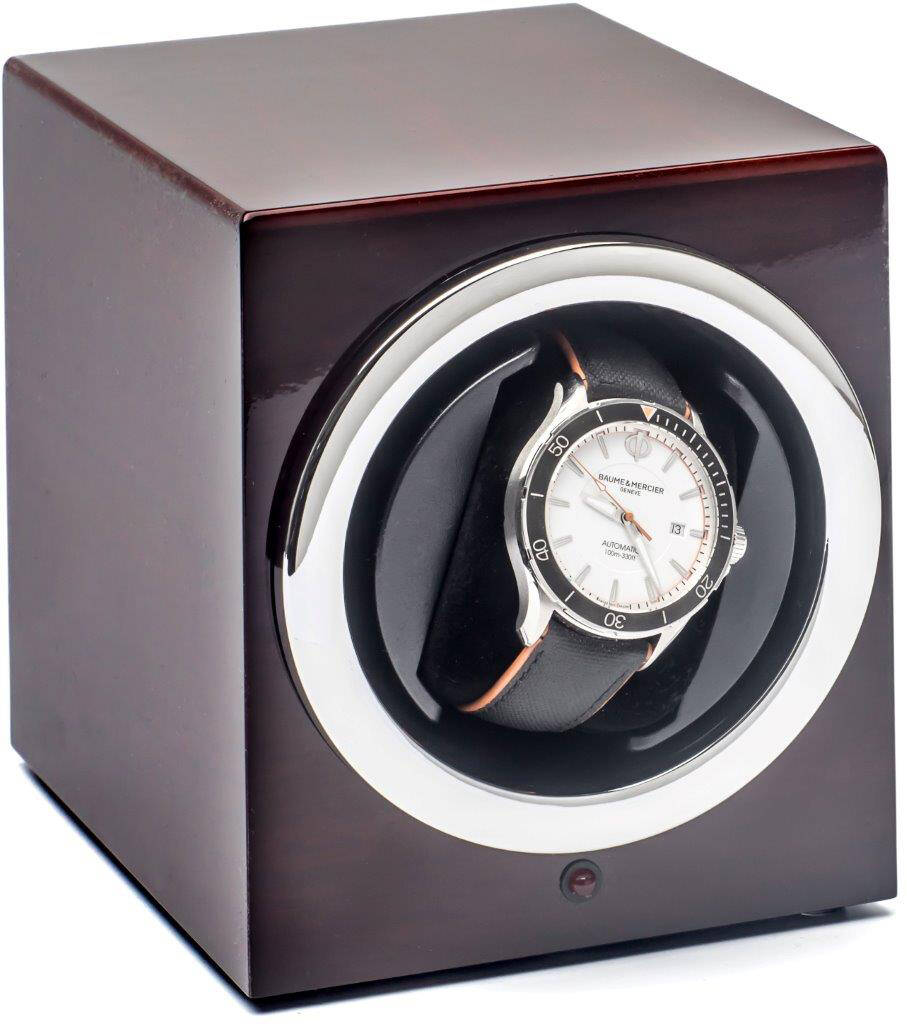 Rhein Fils kellowinder RF7000-02 Single Piano Mahogany on tyylikäs tapa säilyttää automaattikelloa ja pitää se käyttövalmiina kaikissa tilanteissa. Winder on viimeistelty upean kiiltävään mahongin sävyyn ja se on kooltaan n. 12x15x15 cm (L,K,S). Winderin pyörimissuunnan voi määrittää joko myötäpäivään, vastapäivään tai vuorottelevaksi. Kello ei kuitenkaan pyöri laitteessa koko aikaa, vaan pysyy välillä myös paikallaan. Winderissa on äänetön moottori ja sitä voi käyttää myös paristoilla. Saatavilla lisäksi muita laadukkaita Rhein Fils -tuotteita eri väreissä ja esim. kahdelle kellolle. Löydä omasi!