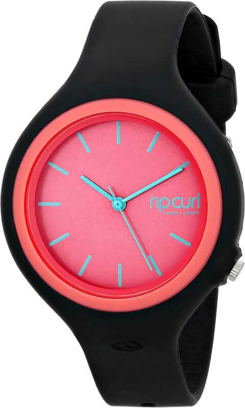 Naisten sporttisen tyylikäs Rip Curl Aurora A2696G 20 Pink rannekello. Kellon musta runko on valmistettu muovista ja kellon musta ranneke on valmistettu kumista/silikonista. Kellotaulu on väriltään raikkaan pinkki, jossa on turkoosit indeksit ja osoittimet. Rungon leveys on 37mm ja rannekkeen leveys on 14mm. Rip Curl kelloille myönnetään 5 vuoden takuu ja ne toimitetaan valmistajan alkuperäisessä rasiassa.