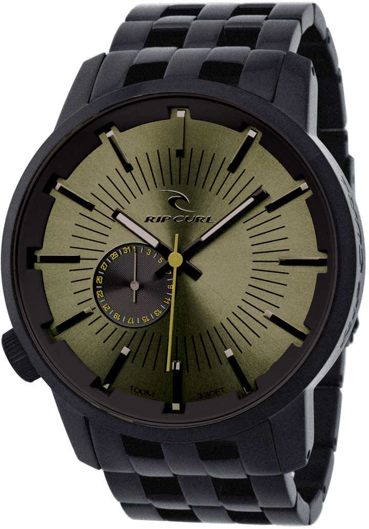 Miesten Rip Curl Pipe Line A2221 854 Military rannekello. Runko ja ranneke on valmistettu ruostumattomasta teräksestä ja ne ovat mustan väriset. Kellotaulu on vihreä, jossa mustat indeksit. Rungon leveys on 50mm ja rannekkeen leveys on 26mm. Rip Curl kelloille myönnetään 5 vuoden takuu ja ne toimitetaan valmistajan alkuperäisessä rasiassa.