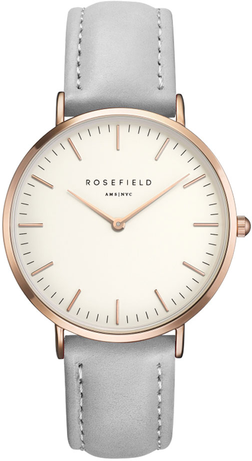 Sulavalinjainen BWGR-B9 Grey-Rose Gold on erittäin tyylikäs kello. Vaalean harmaa, leveimmästä kohdasta mitattuna 17mm levyinen nahkaranneke yhdistettynä punakullan väriseen kellorunkoon. 38mm leveässä ja ainoastaan 7mm vahvuisessa rungossa käy japanilainen quartz -koneisto. Helppohoitoinen Rosefield käy jokapäiväiseen käyttöön.