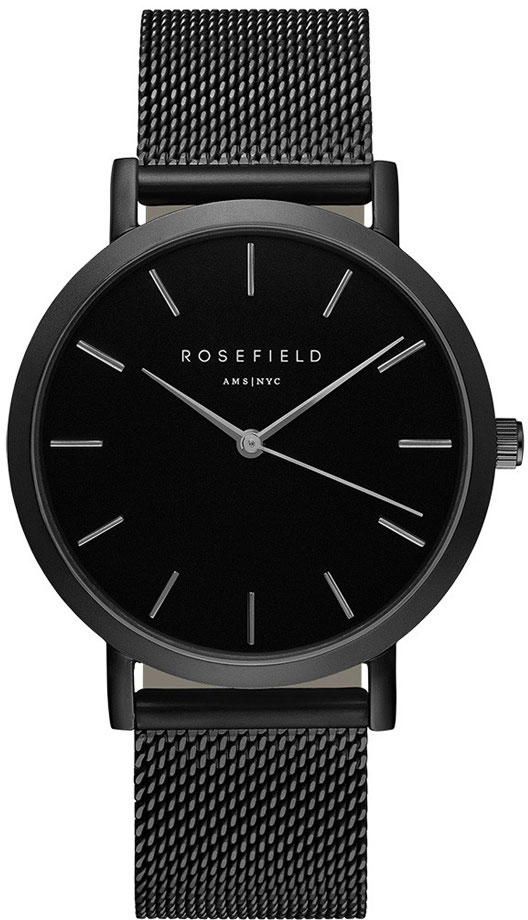 Hyvin tumma Rosefield Mercer MBB-M43 Black rannekello. Mesh-ranneke on erittäin mukava käyttää ja sen kestävyys on hyvä, sillä se on valmistettu ruostumattomasta teräksestä. Ranneke on leveydeltään 18mm ja sen pituus on säädettävissä välillä 15,5-20cm. Rannekellon ulkonäkö on huomiota herättävä mustan värityksensä ansiosta. 38mm metallinen kellorunko on sirosti muotoiltu ja se on paksuudeltaan 8mm. Sulavalinjainen kello käy asusteeksi kaikkiin tilanteisiin tumman värityksensä ansiosta.